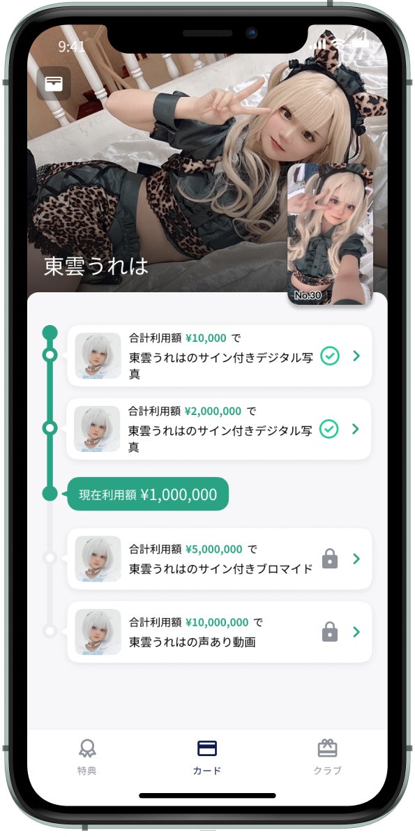 累計決済金額に応じて、下記の限定コンテンツがもらえます。全ての特典を獲得した際には、ナッジカードアプリからどんな特典が欲しいかリクエストを送ることが可能になります。リクエストいただいた内容をもとに新特典が追加されていく予定です。