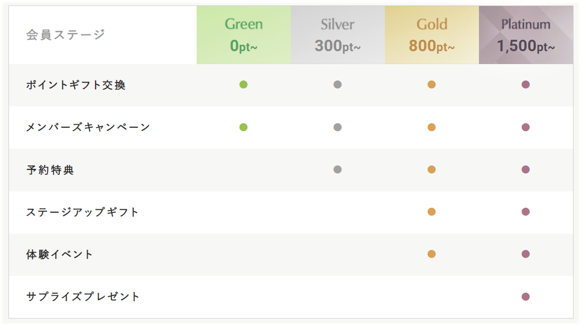 お客様が年間にためたファンポイントに応じて4つのステージを設け、各ステージにてさまざまな特典をご用意。会員登録(無料)をしていただければ、すぐに「グリーンステージ」の特典を受けることができます。