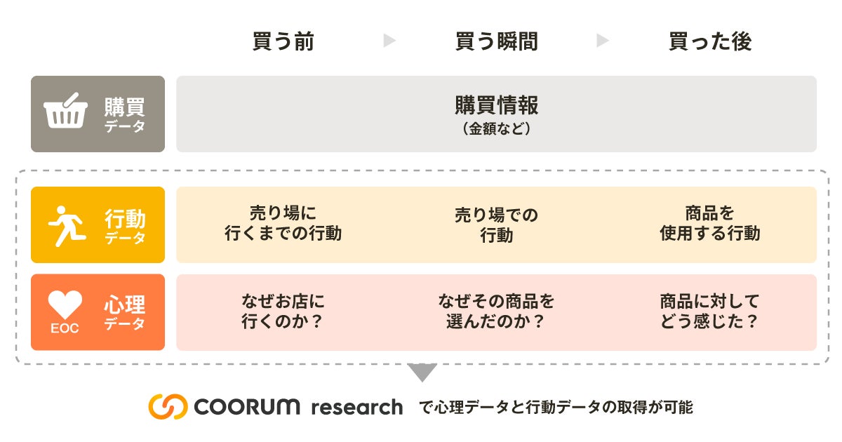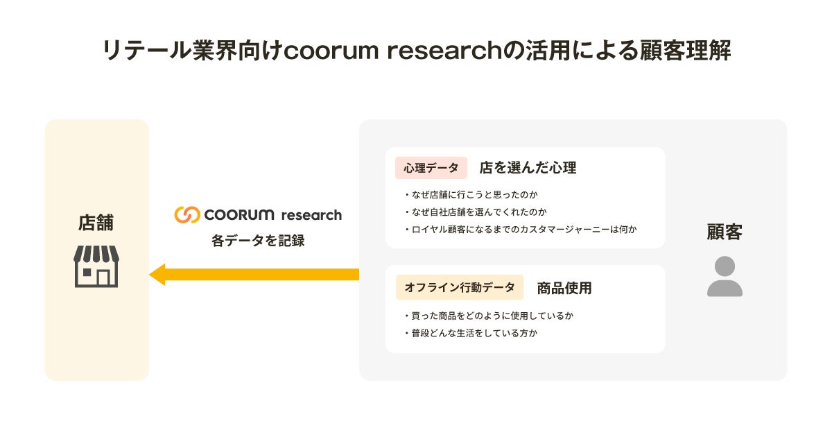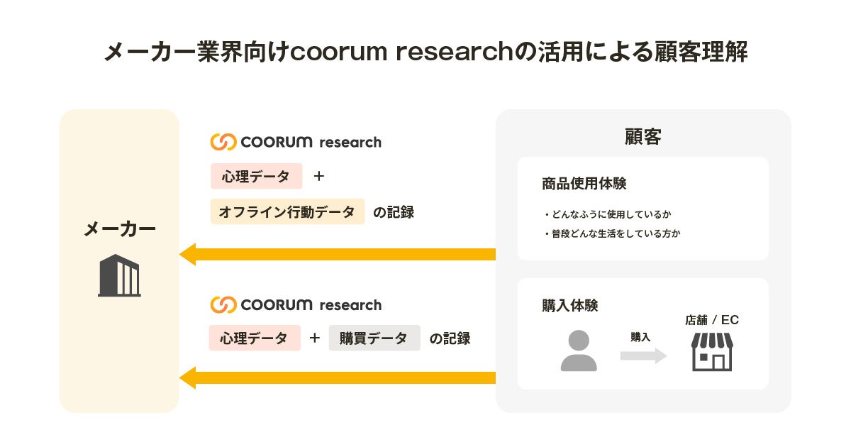 coorum research を活用することで、顧客の本音が載せられた顔の見える“購買データ”をメーカー自らで直接収集し、顧客がどのように自社商品を買うに至るのか、そして買った後に日々の生活でどのように使っているのか、理解することができます。