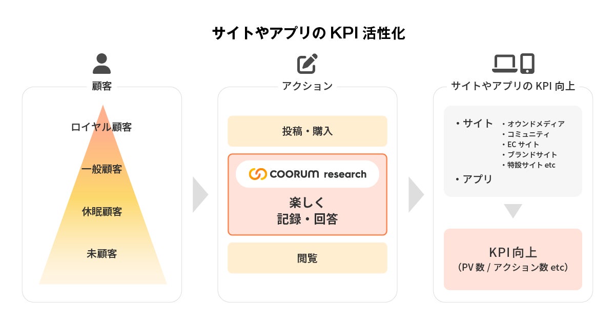 企業は、自社のサイト・アプリ・店舗の顧客との接点/導線上にcoorum research を導入することにより、顧客がポップアップなどを通じて楽しく直感的に体験記録できる仕組みを設置することができます。これにより、従来の市場調査では時間とコストがかかっていた調査を手間なく簡単に実施することや、これまで得られなかった顧客の本音を収集することが可能です。