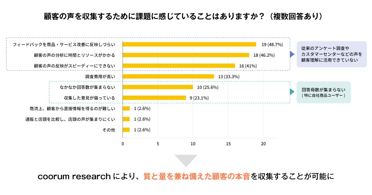 Asobicaが「coorum」導入企業向けに、顧客の声を収集する上での課題に関してヒアリングしたアンケートでは、第1,2,3位に「従来のアンケート調査やカスタマーセンターなどの声を、顧客理解に活用できていない」、第5,6位に「(特に自社商品ユーザーの)回答母数が集まらない」といった意見が寄せられていました。