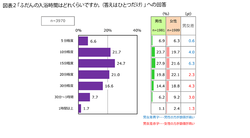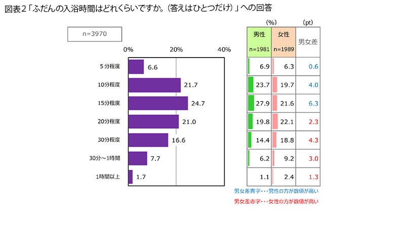 次にふだんの入浴時間がどれくらいかを聞くと(図表2)、最も割合が高かったのは「15分程度」(24.7%)でした。次いで、「10分程度」(21.7%)、「20分程度」(21.0%)の順でした。ただ、「30分程度」「30分〜1時間」「1時間以上」の人を合計すると26.0%となり、全体の4分の1を超えます。