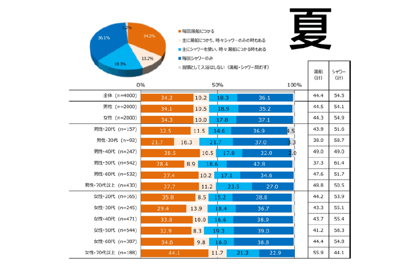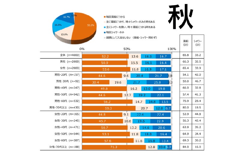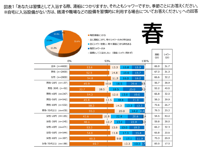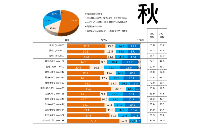 今回の調査で目を引くのが「男性・20代」「男性・30代」「男性・40代」の湯船につかる割合です。年間を通じて、「男性・30代」は「男性・20代」より湯船につかる割合が低く、「男性・40代」は「男性・50代」より割合が高くなっています。このような傾向は女性の場合、夏を除いて見られません。