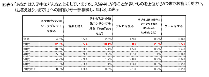 また、全体で見ると「スマホやパソコン・タブレットを見る」(4.5%)、「音楽を聴く」(3.5%)、「テレビ以外の映像コンテンツを見る(YouTubeなど)」(2.6%)といった項目は割合が低いのですが、20代だと、「スマホやパソコン・タブレットを見る」が12.0%、「テレビ以外の映像コンテンツを見る(YouTubeなど)」が10.1%、「音楽を聴く」が9.5%と、割合が跳ね上がっています(図表5)。