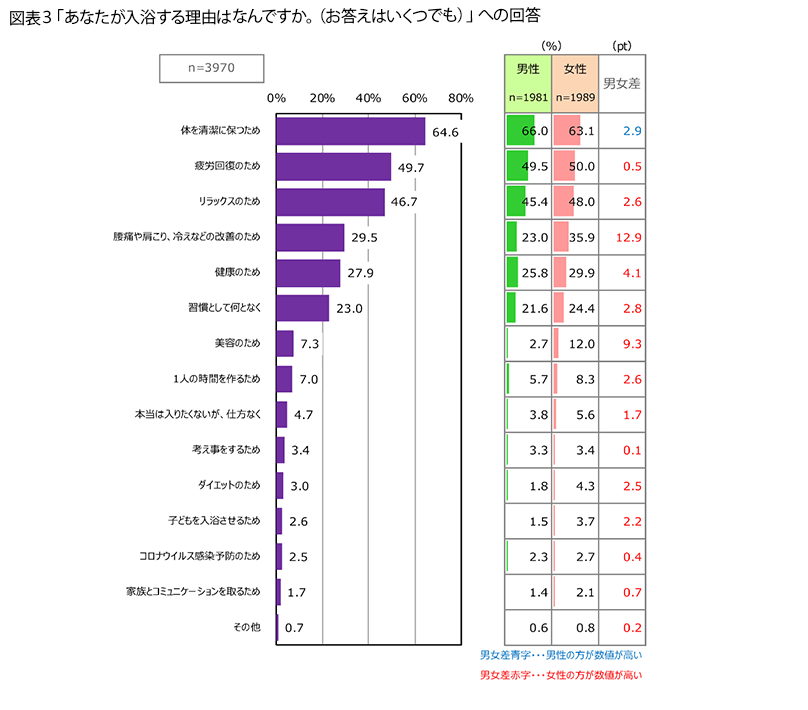 入浴する理由を尋ねたところ(図表3)、最も割合が高かったのは「体を清潔に保つため」の64.6%でした。
