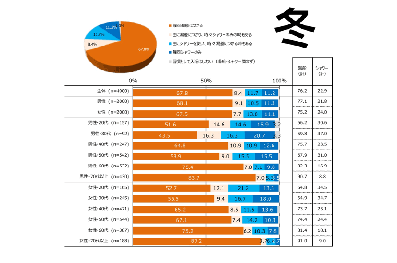 結果、「冬に毎回湯船につかる」という人の割合は、20代男女が52.2%であるのに対して、70代以上の男女は84.8%と大きな差がついています。