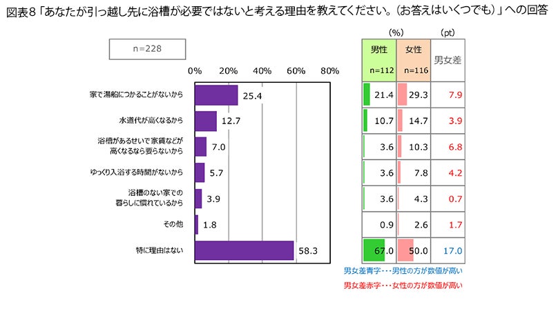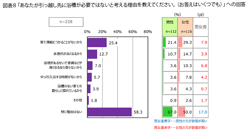 「必要ではない」と答えた人にその理由を聞くと(図表8)、「特に理由はない」(58.3%)という人が半数を超えていましたが、それに次いで「家で湯船につかることがないから」(25.4%)、「水道代が高くなるから」(12.7%)という結果でした。