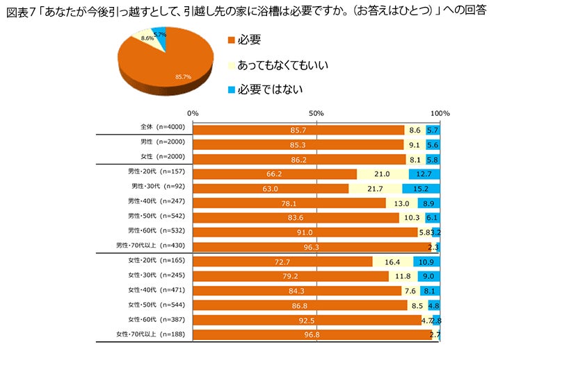 夏を除けば、半数以上の人がシャワーだけでなく湯船につかるという結果でしたが(図表1)、今後引っ越すとして、引越し先の家に浴槽が必要かどうかを聞くと(図表7)、「必要ではない」と回答した人の割合は5.7%で、「必要」が85.7%、「あってもなくてもいい」は8.6%でした。「必要」と回答した人の割合は、「男性・30代」を除けば、男女とも、年齢が上になるほど高くなっています。