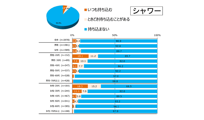 湯船につかる場合、「女性・20代」は19.5%が「ときどき持ち込むことがある」と回答しているため、「いつも持ち込む」と合計すると46.3%になり、浴室にスマホなどを持ち込む人と持ち込まない人がほぼ半々になっています。