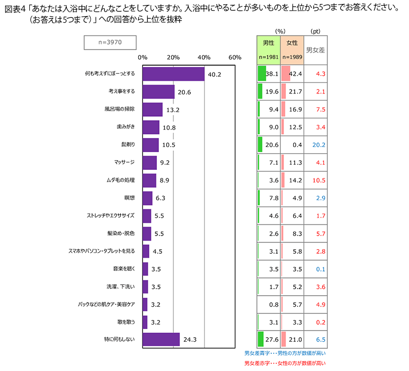 入浴中にどんなことをしているかを聞くと(図表4)、最も割合が高かったのは「何も考えずにぼーっとする」の40.2%でした。