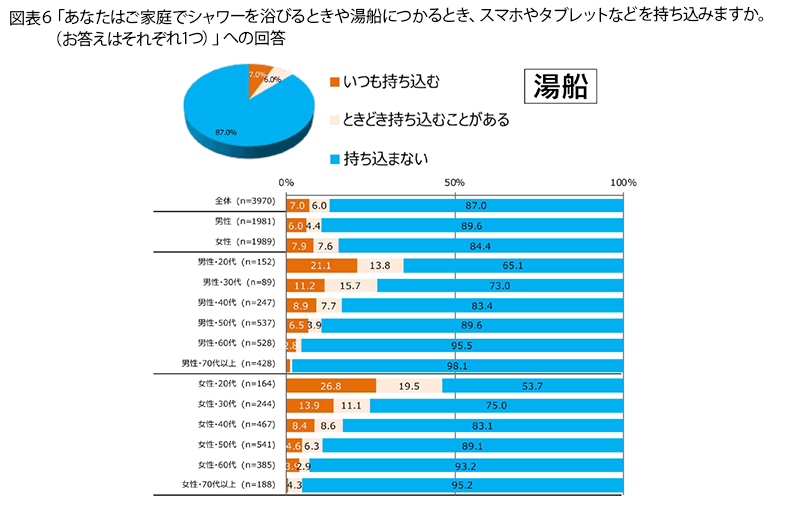 シャワーを浴びるときや湯船につかるとき、スマホやタブレットなどを持ち込むか聞いたところ(図表6)、湯船につかるときに「いつも持ち込む」と回答したのは7.0%、「ときどき持ち込むことがある」が6.0%で、シャワーを浴びるときに「いつも持ち込む」は4.8%、「ときどき持ち込むことがある」は4.4%で、合計でも1割前後でした。