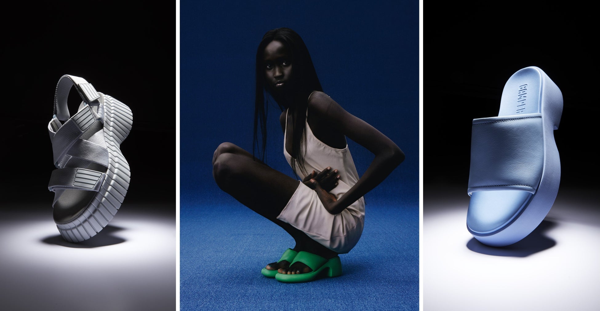 ローファーモデルが人気の「THELMA」から、夏用のサンダルが初登場しました。「THELMA SANDAL(テルマ サンダル)」は、「THELMA」の特徴である90年代からインスパイアされたプラットフォームはそのままに、プレイフルな雰囲気と大胆なシルエットを備えました。ベーシックなアッパーデザインに大胆なカーブを描くボリュームソールがモダンでエッジ―なムードを演出します。パッド入りのトングサンダルと華奢な2ストラップサンダルには生産過程における水の消費量を抑えたレザーを使用しています。ミュールはリサイクルPET素材を採用し、スポーティな印象に仕上げました。