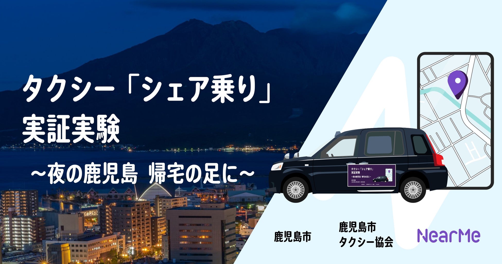 移動に関する課題解決に取り組むソーシャルデザインカンパニー、株式会社NearMe(本社:東京都中央区、代表取締役社長:髙原幸一郎、以下「ニアミー」)は、鹿児島市(下鶴 隆央市長)からの委託を受けて、夜間の中心市街地エリアから周辺の住宅団地までを便利でおトクに移動できる手段としてタクシー『シェア乗り』の実証実験を2025年1月20日(月)より開始します。また、本実証実験の開始に伴い、1月17日(金)10:00よりタクシー『シェア乗り』の事前予約を開始します。