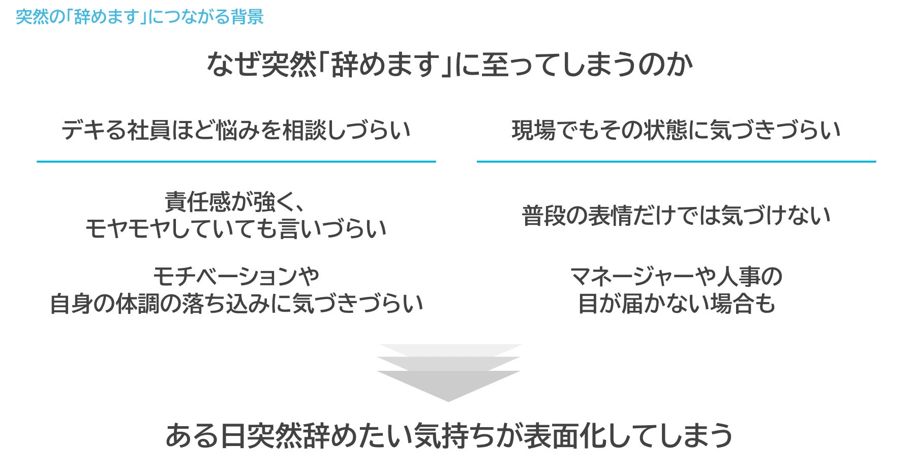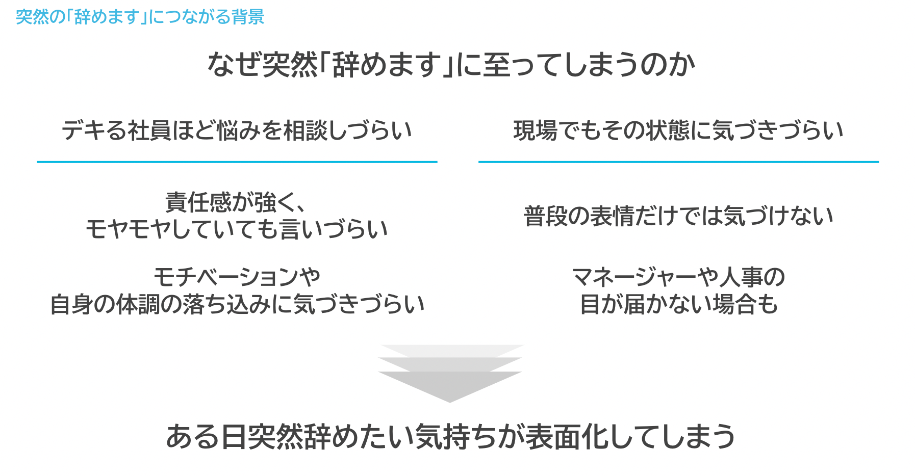 まず、なぜ突然「辞めます」という事態に陥るのかについては、悩みを抱え込んでしまって相談し辛いこと、現場でもその状態に気づきにくいという環境から退職意向が隠れてしまうことが要因になります。