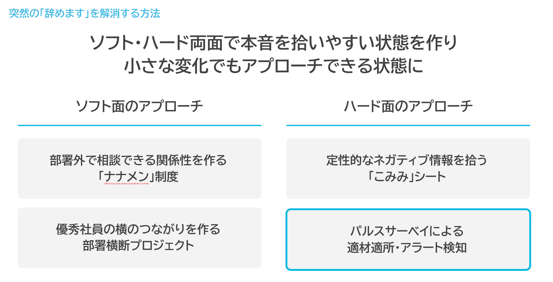 私の前職のサイバーエージェントで行っていた施策なのですが、そこでは、社内の人間関係などのソフト面・ネガティブな情報要素をいかに拾うかなどのハード面、両面で本音を広げやすい状態を作り小さい変化にもアプローチできる状況を作っていました。