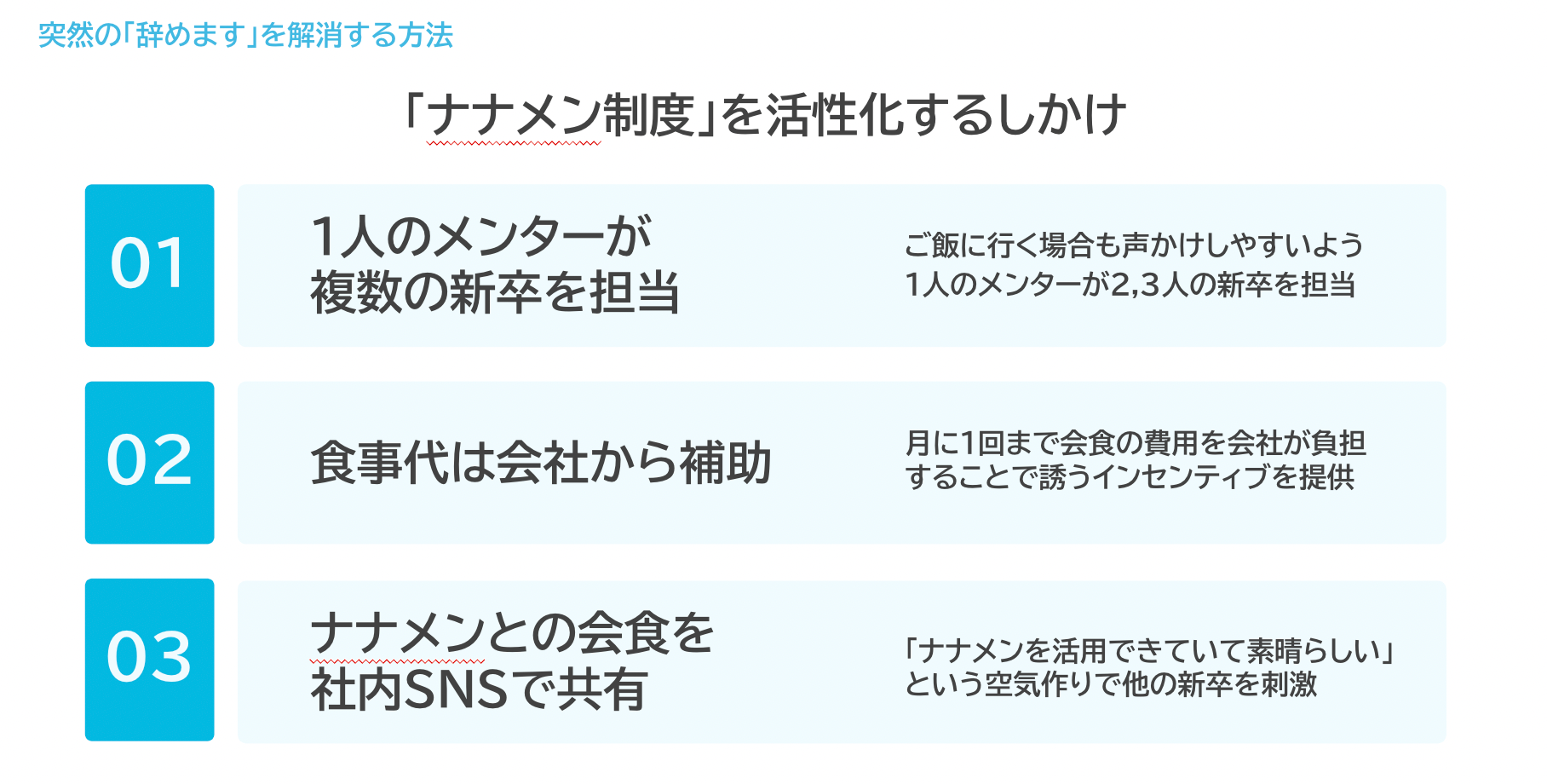 ソフト面では、部署外で相談できる『ナナメン制度』を作り、内定者と相性が良く別部署で働く社員を「ナナメンター」としてマッチング。定期的な食事や面談などでメンタリングを実施していました。