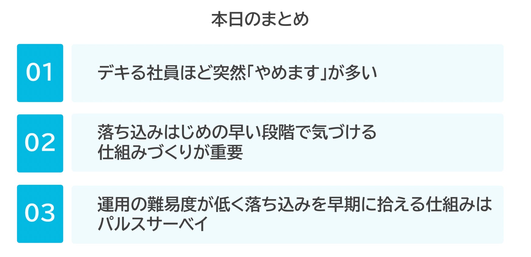 こういった様々な施策を経ながら、優秀な社員のちょっとした変化を拾うことでカルチャーを醸成し、離職率を下げることができます。