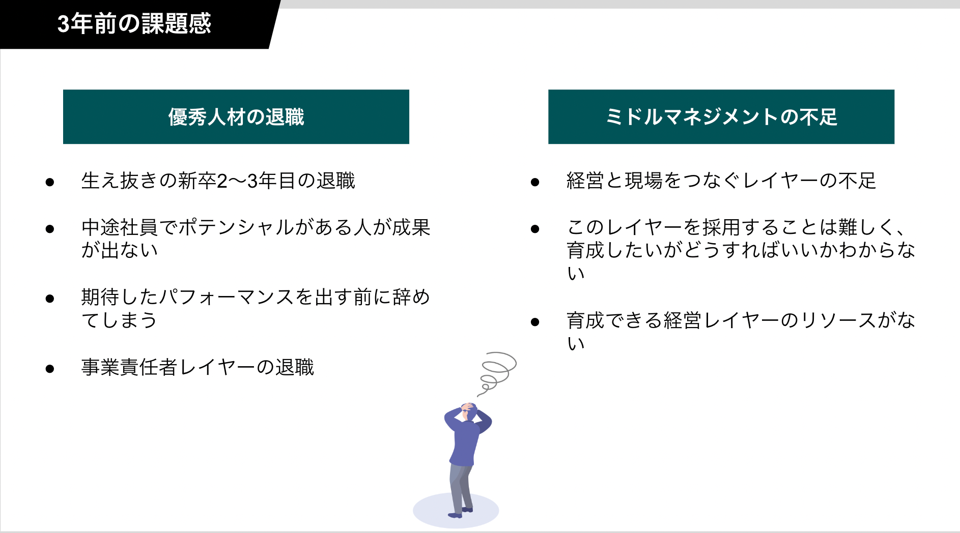 3年前、弊社でも新卒2~3年目や期待値の高い中途社員が退職したり、経営層と現場を繋ぐレイヤーの人材が不足するなど、優秀な人材の退職・ミドルマネジメントの不足とに課題を感じていました。