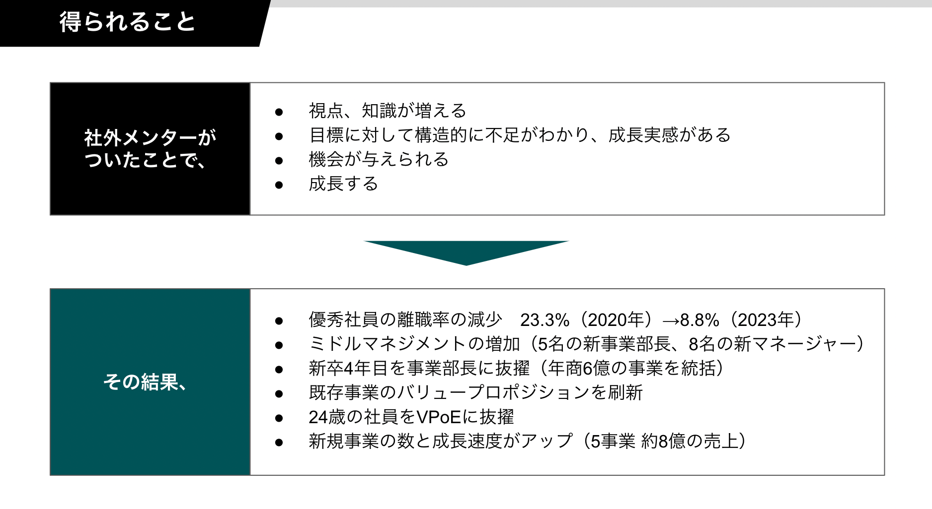 メンターの活用により、Hajimariの離職率は1/4に、新規事業部長5名の抜擢、新マネージャー8名、新規事業5つ、売上8億円の創出につながりました。