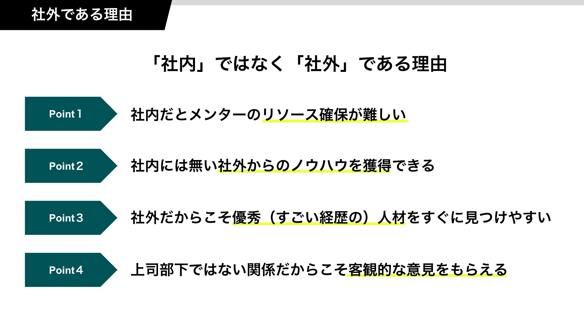 社外人材をメンターとすることで、リソース確保の難しい役職者の育成を実現できたり、客観的なアドバイスを教授することが可能です。