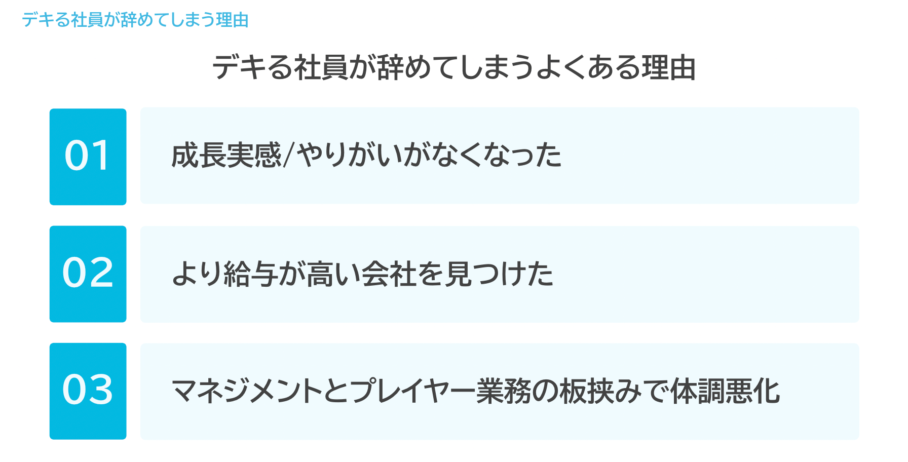 加藤:社員が退職する理由として多い3つと、その要因をご紹介します。