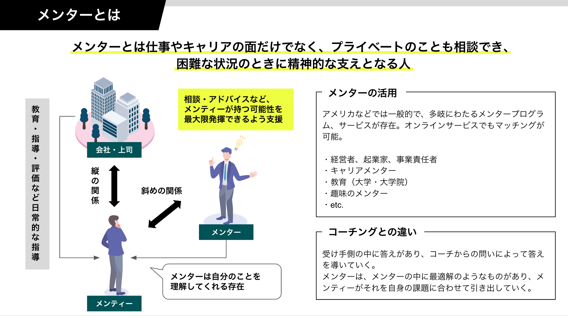 メンターとは「相談者」という意味で上司と部下の縦の関係とは異なる「ナナメの関係」のメンターだからこそ、キャリア全般についてのアドバイスを受けられ自身の成長につながる精神的な支えとなることができます。アメリカではすでに幅広い領域で活用されているそうです。