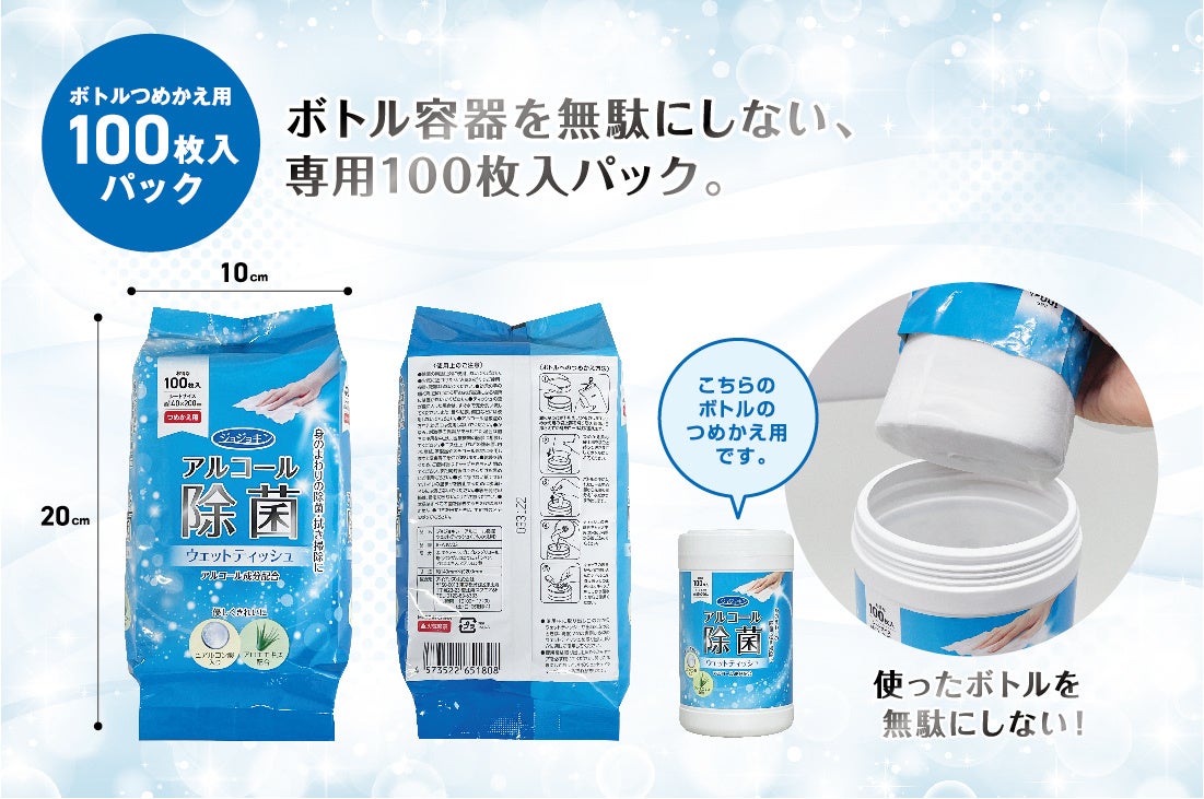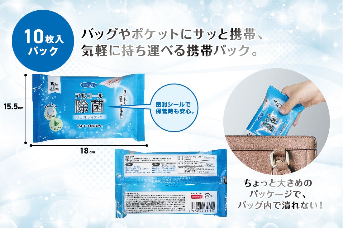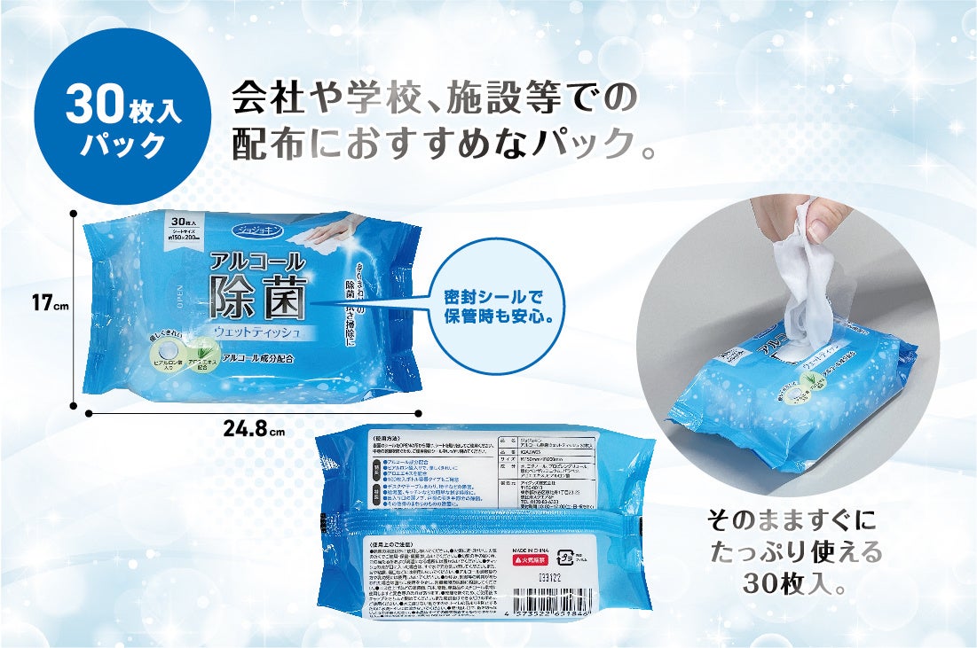 大容量で、使用頻度の高い場所や業務用、災害時の備えとしてオススメな100枚入ボトル、つめかえ用100枚入パック、会社や学校、施設等での配布・普段使いに適した30枚入パック、コンパクトなためバッグに入れて持ち歩け、手を洗えない外出先での食事やトイレなどで重宝する10枚入パック、4種から用途に応じてお選びいただけます。