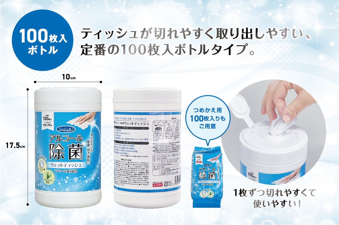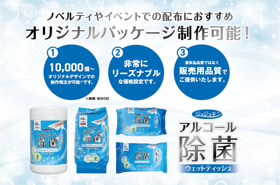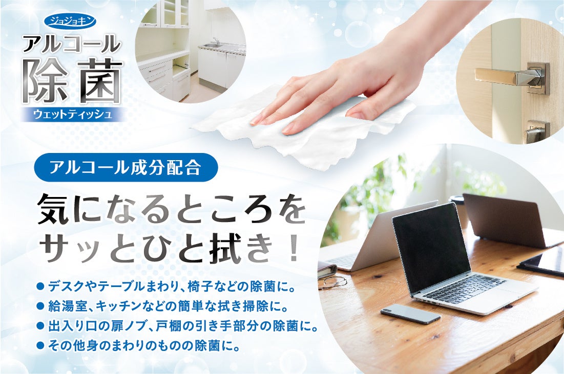 完全特注のオリジナルグッズの企画生産、およびウイルス対策グッズメーカー事業を手がけるアイグッズ株式会社(本社:東京都渋谷区)は、アルコール成分配合でデスクや椅子、ドアノブなど身の回りのものを幅広く手軽に掃除・除菌できる「アルコール除菌ウェットティッシュ ジョジョキン」を新発売。業務用、施設での配布用、外出用と用途に応じて4種類からお選びいただけます。