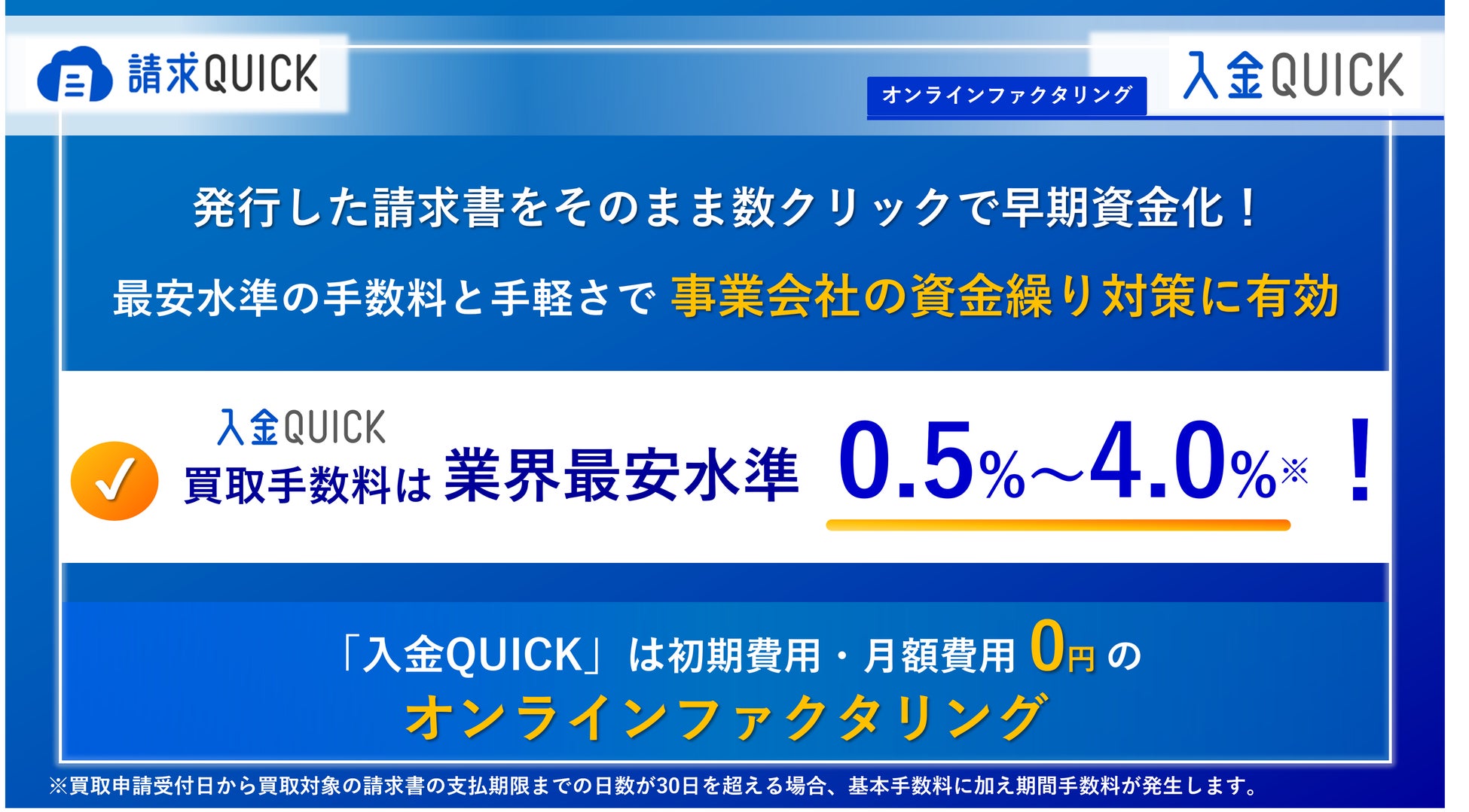「入金QUICK」は、中小企業の突発的な資金ニーズにスピーディーに対応可能なオンラインファクタリングサービスです。「請求QUICK」で発行した請求書をそのまま数クリックで資金化でき、基本手数料は買取対象とする請求書金額の0.5%~4.0%*1と業界最安水準かつ初期費用や月額固定費用のないシンプルな料金体系で、請求書買取申請から最短2営業日*2でお振込みが可能です。「入金QUICK」は、中小企業の皆さまが抱える資金繰りに関する課題を「安さ・早さ・手軽さ」すべての点において解消し、事業の成長をご支援いたします。