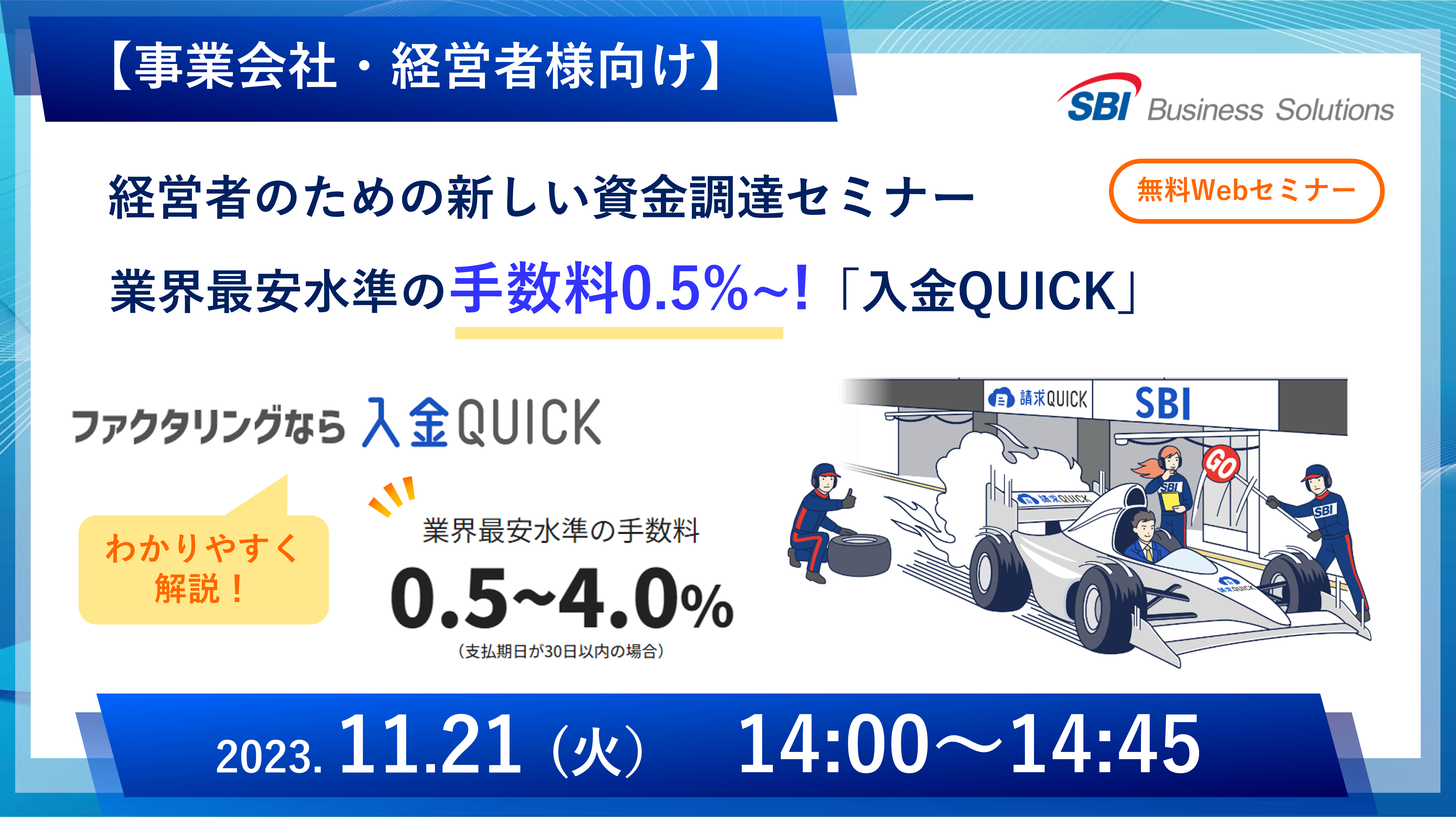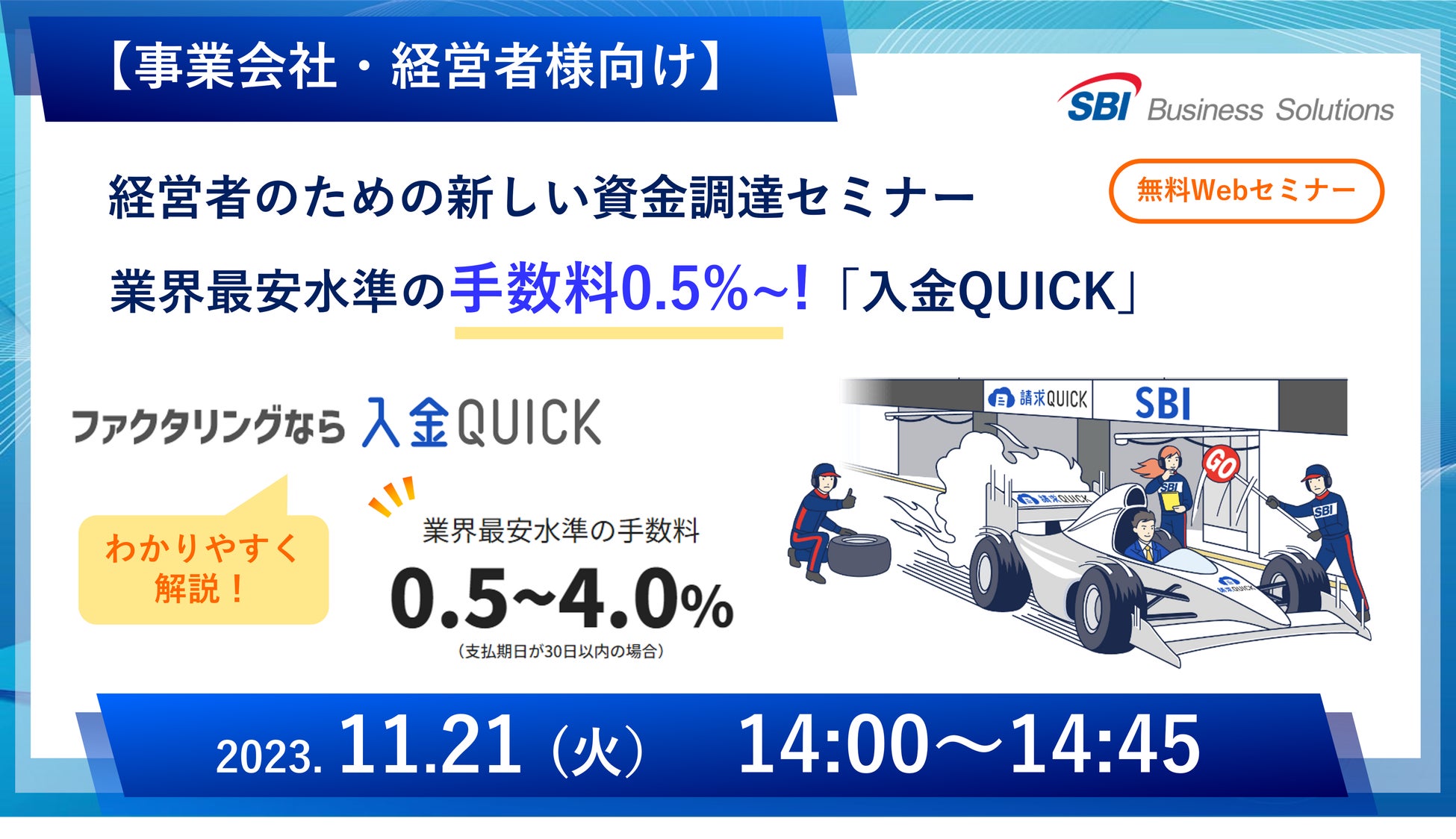 【事業会社・経営者様向け】業界最安水準の手数料0.5%~!新しいファクタリング「入金QUICK」セミナーを11月21日に開催