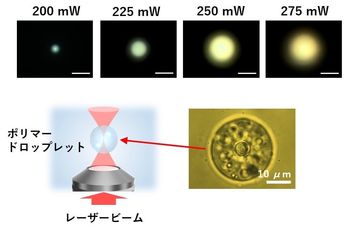大阪公立大学大学院理学研究科の永井 達也大学院生(当時 大阪市立大学大学院理学研究科 後期博士課程3年)、寺西 彩月大学院生(博士前期課程1年)坪井 泰之教授、神奈川大学理学部の東海林 竜也准教授、東京医療保健大学大学院医療保健学研究科の松村 有里子准教授らの共同研究グループは、レーザー光の焦点に形成された微粒子(ドロップレット)に、水溶液中の高分子を集める「光ピンセット技術」を応用し、溶液に混合した二種類の蛍光分子(青く光るエネルギー供与体と、オレンジ色に光るエネルギー受容体)をドロップレット内に抽出・濃縮しました。FRETは蛍光分子間の距離が近いほど起こりやすいため、レーザー光の強度を上げ、ドロップレット内の蛍光分子の濃度を高めることで、FRETの反応速度と効率の制御に成功しました。また、FRETが加速するとドロップレットが青色から緑色、黄色、オレンジ色へと連続的に変化するため、反応過程の可視化も実現しました。