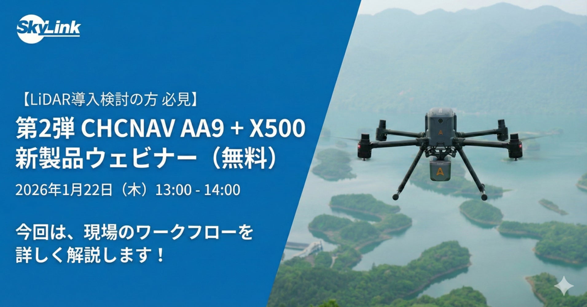 ドローンの販売や産業向けソリューションを展開する、SkyLink Japan(株式会社WorldLink & Company 本社:京都市北区、代表取締役:須⽥信也)は、圧倒的コストパフォーマンスで話題のUAV LiDAR新製品「CHCNAV AA9+X500セット」のオンライン技術解説ウェビナーを2026年1月22日(木)に開催いたします。