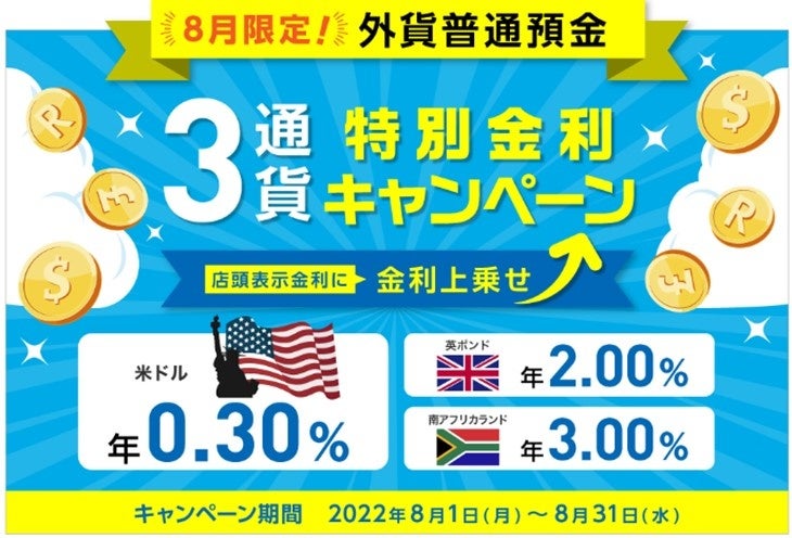 本日より開始 8月限定!外貨普通預金3通貨の特別金利キャンペーン