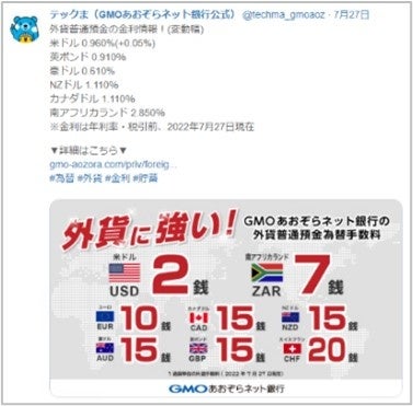 外貨普通預金の金利に変更がある場合は、公式Twitter「テックま(@techma_gmoaoz)」にて金利情報を配信しています。このほかに、経済指標などの情報も配信しておりますので、あわせてご活用ください。
