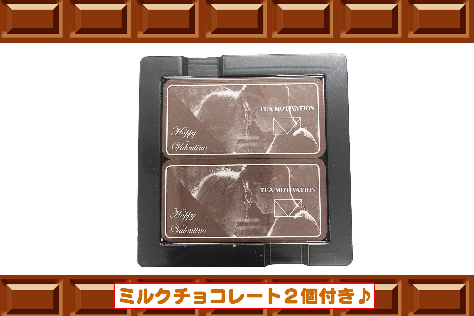 さらに、紅茶ブランドのロゴと愛し合う恋人たちのイメージがデザインされた、特別なパッケージに包まれたチョコレートを2枚お付けしました。厳選されたカカオ豆を使用した、株式会社モアザンチョコレート製の上質なチョコレートとなっています。