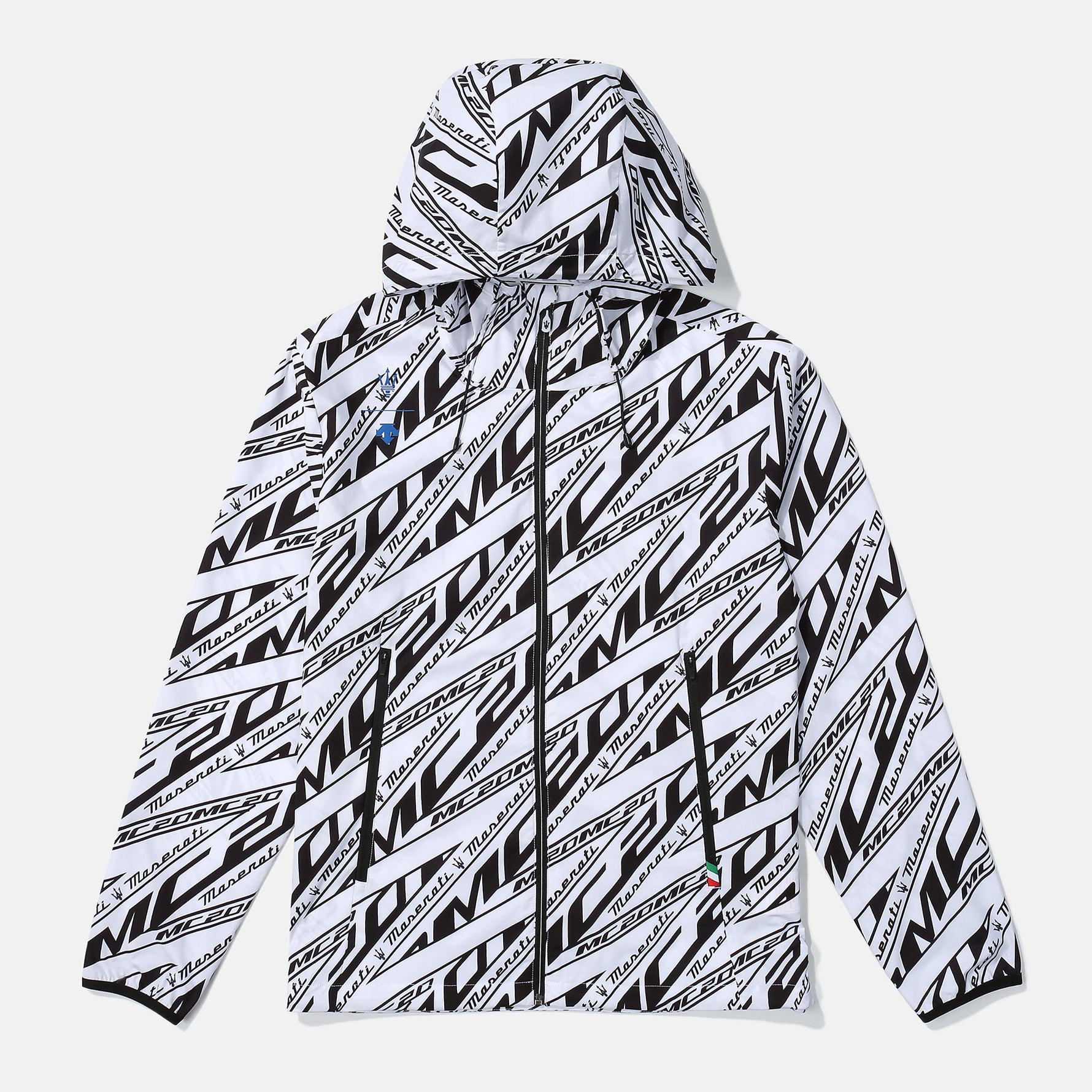 「MC20」のアクティブなイメージをモチーフにしたグラフィックパターンデザインが印象的なメカニカルストレッチ素材のライトアウター。