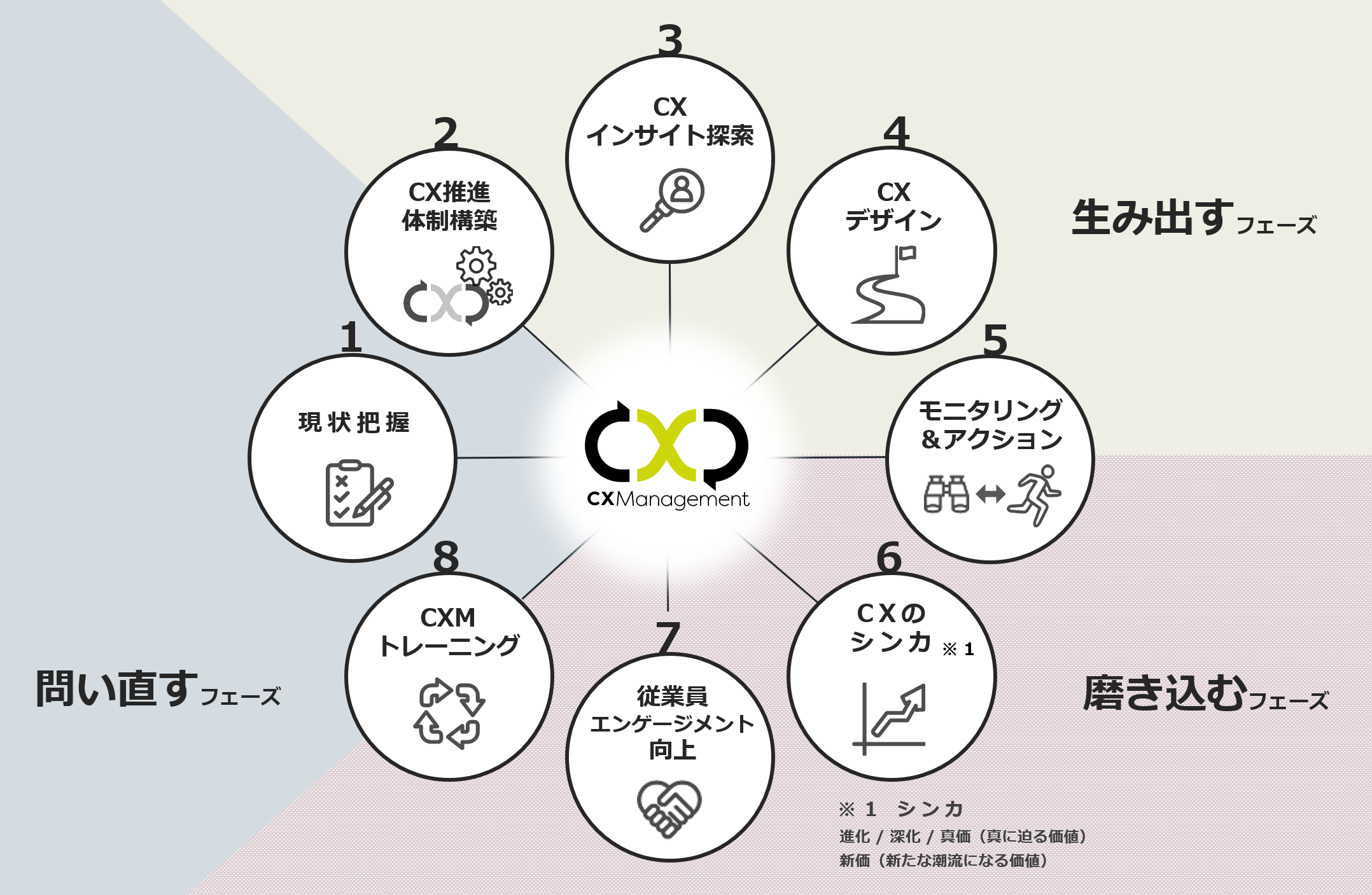 本サービスには、“顧客ニーズ”を捉えるだけではなく、“自社らしさ”を活かして唯一無二のCXを生み出すためのノウハウが凝縮されています。また、CXマネジメントのプロセスを「問い直す」「生み出す」「磨き込む」の3つのフェーズに分け、8つの支援サービスをご提供することで、一貫性を持ったCX向上を実現いたします。課題の優先度に合わせ、必要な支援サービスを選択していただくことも可能です。