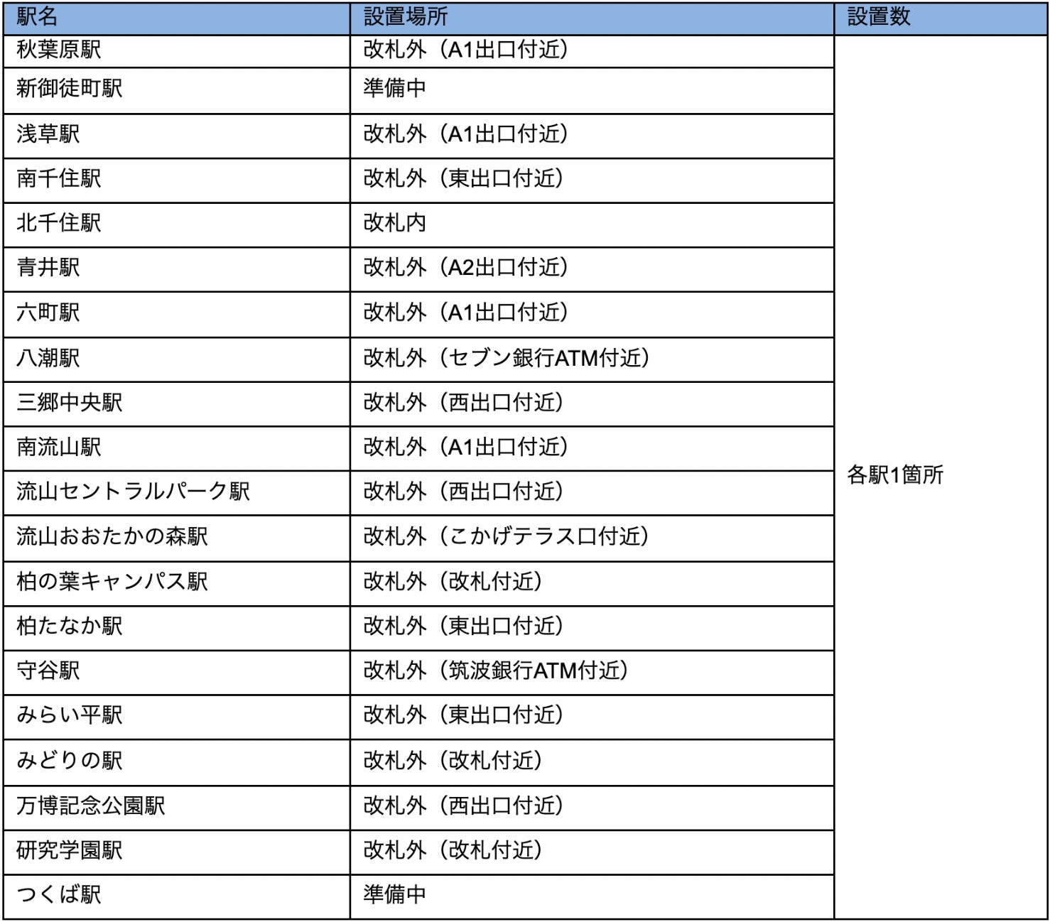 2024年3月28日(木)より、新御徒町駅とつくば駅を除く18駅でサービス提供開始いたします。※新御徒町駅とつくば駅については、準備が出来次第設置いたします。