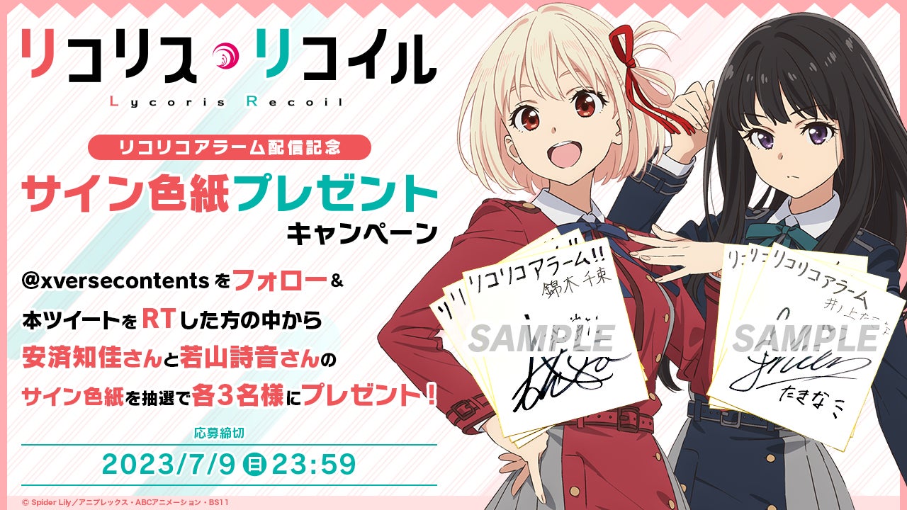 Twitterアカウント 『 @xversecontents 』 をフォローし、キャンペーンツイートをリツイートしていただいた方の中から抽選で、錦木千束役・安済知佳さんと井ノ上たきな役・若山詩音さんのサイン色紙を各3名様ずつ、計6名様にプレゼント!皆様のたくさんのご応募お待ちしています。