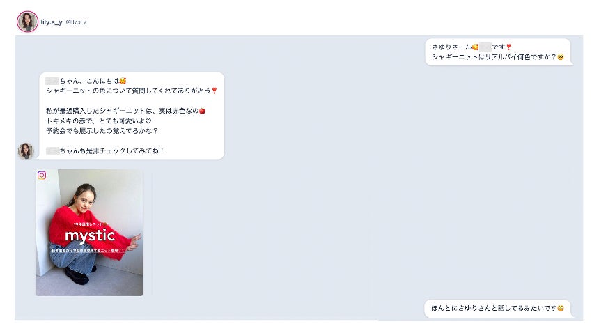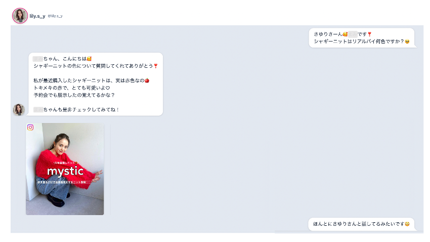 AIではなくインフルエンサースタッフその人とコミュケーションを取っているような感覚で対話を楽しみながら、ファッションに関する相談や新しいファッションアイテムを発見することができます。