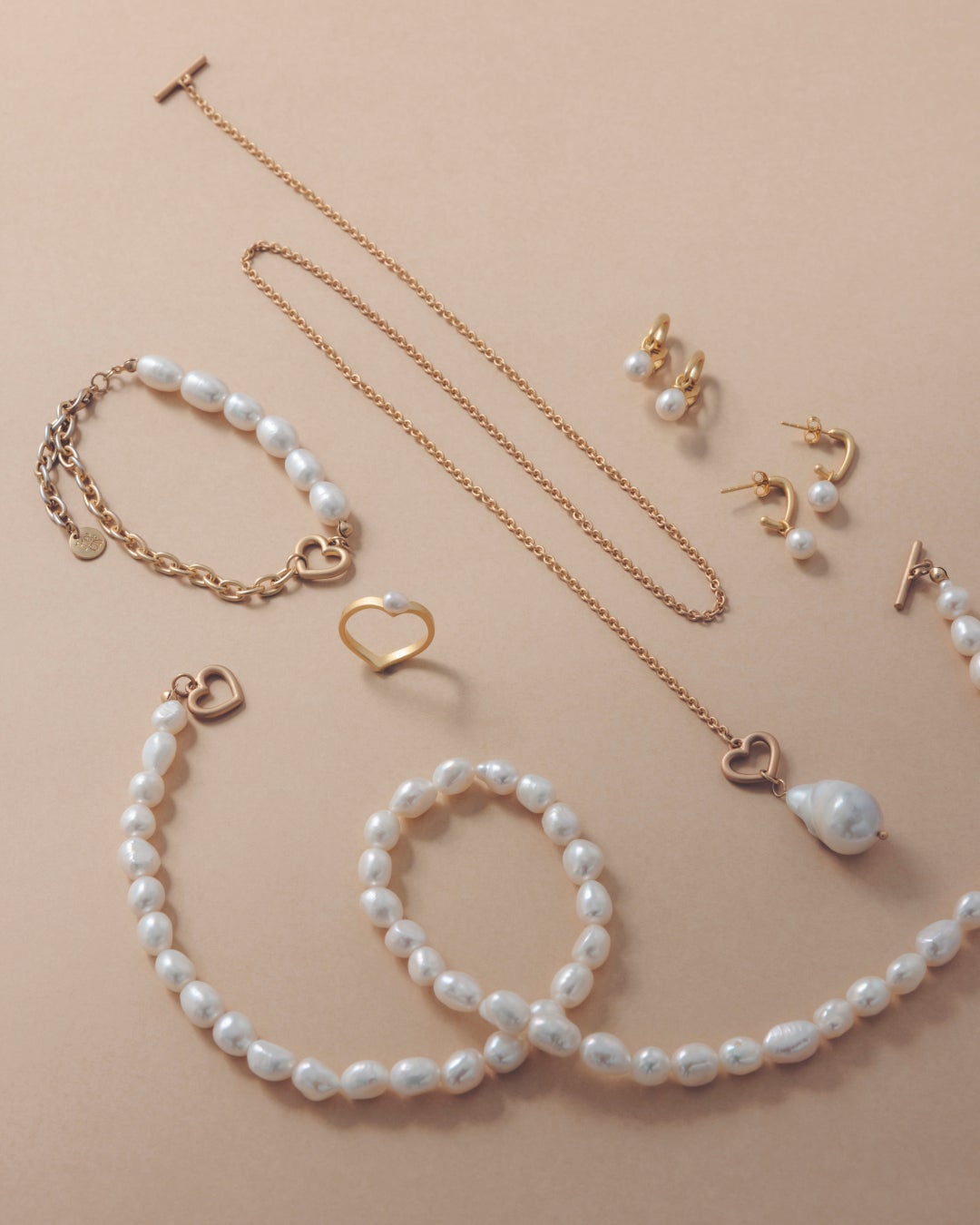 また、ハートを連想するような形のアイテムも展開しており、可愛らしい印象のアイテムから、スタイリッシュな印象のアイテムまでラインナップしております。一連でお楽しみいただけるのはもちろん、パールのアイテムを2連で重ね付けするなど、さまざまなアイテムと組み合わせやすいデザインです。