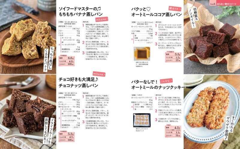 このほかNadia Artistの中でもダイエットレシピに定評があるこんななさん、藤本マキさん、くまみさんにダイエット経験と食べやせ成功のカギとワザを教えてもらう「ダイエットヒストリー」や、ヘルシーな野菜・卵・豆腐を使った栄養たっぷりの「簡単副菜」、糖質オフだから安心の「ごはん&麺」などやせるコツとレシピが詰まった大満足の1冊になっています。