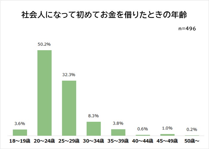 社会人になって初めてお金を借りた年齢で最も多かったのは「20~24歳(50.2%)」でした。