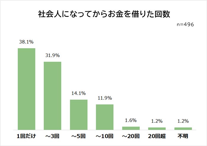 「社会人になってからお金を借りた回数」を尋ねたところ、平均は3.8回でした。しかし、最も多かったのは「1回だけ」という回答でした。家計管理が甘く、お金を借りたことを反省し、その後はしっかりとやりくりするようになった人も多いようです。