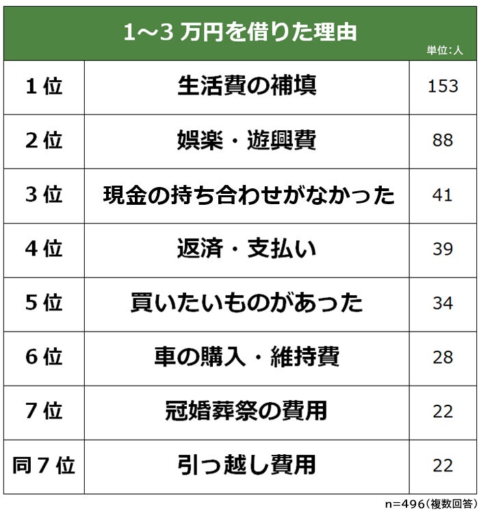 【社会人になってから1万円~3万円のお金を借りた理由ランキング】496人アンケート調査