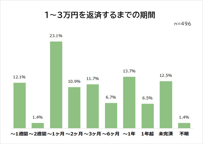 ただ、最も多かったのは「2週間超~1ヶ月(23.1%)」で、「次の給料日に返済した」という回答が目立ちました。また、「持ち合わせがないので借りた」という場合には、翌日や数日以内に返済した人も多く見られます。