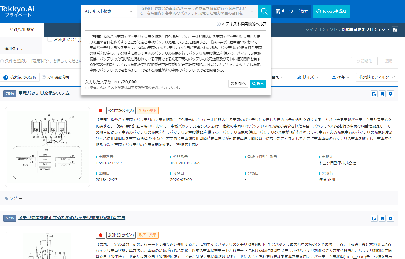 ※「AIテキスト検索」でバッテリーに関する類似特許を検索