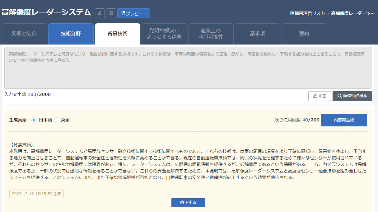 ※簡単な発明概要を入力するだけでAIが特許文案を生成。