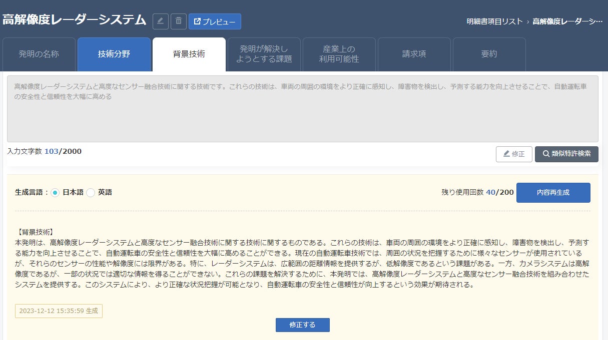 このように、特許文案の生成AI機能とAI検索機能を組み合わせることで、自動車産業はイノベーションの創出と保護、市場適応性の向上において、より迅速かつ効果的なアプローチを取ることが可能になります。特に、新しいアイデアの迅速な特許化と市場分析は、競争の激しい業界において重要な利点をもたらします。