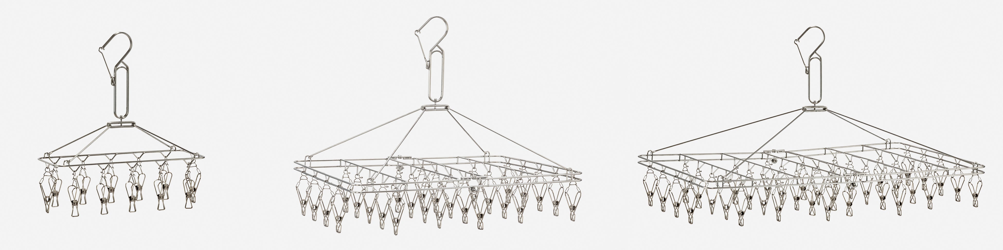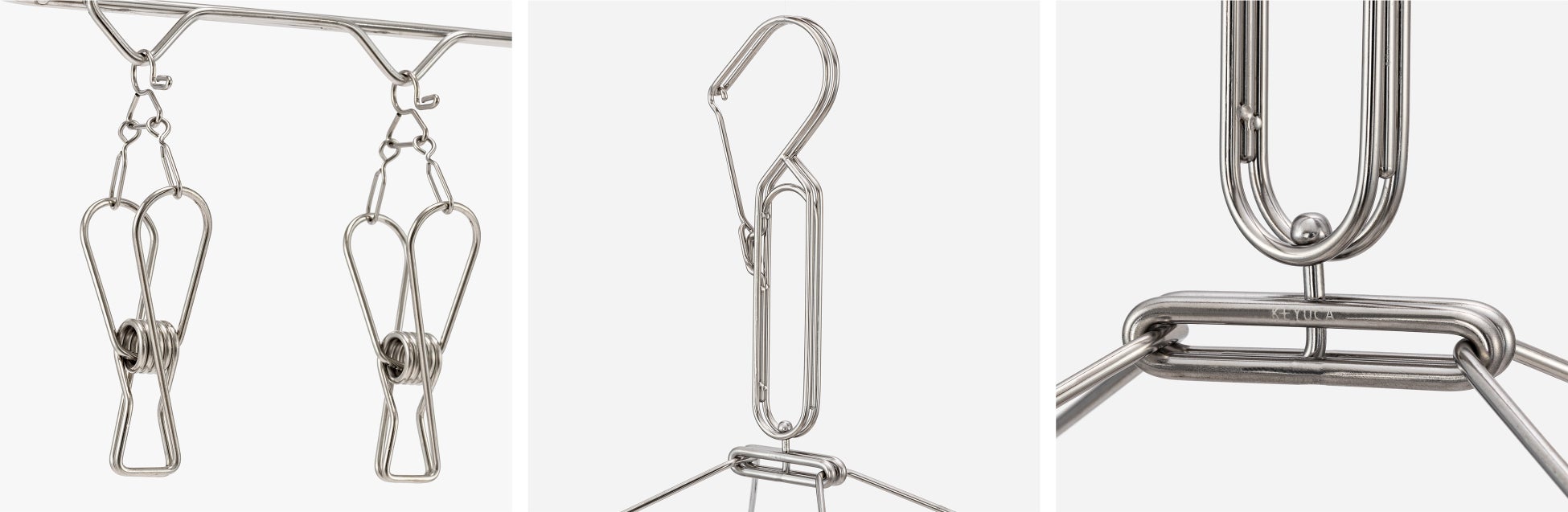 KEYUCA完全オリジナルデザインのステンレスピンチハンガーが目指したのは、「ピンチが絡まりにくく、使いやすくて高級感がある」ということ。絡まりにくい設計にこだわるだけではなく、部屋干ししてもお部屋の雰囲気を損なわない、高級感があり長く使えるピンチハンガーが誕生しました。- 「AST 絡まりにくいステンレスピンチハンガー」シリーズの特徴